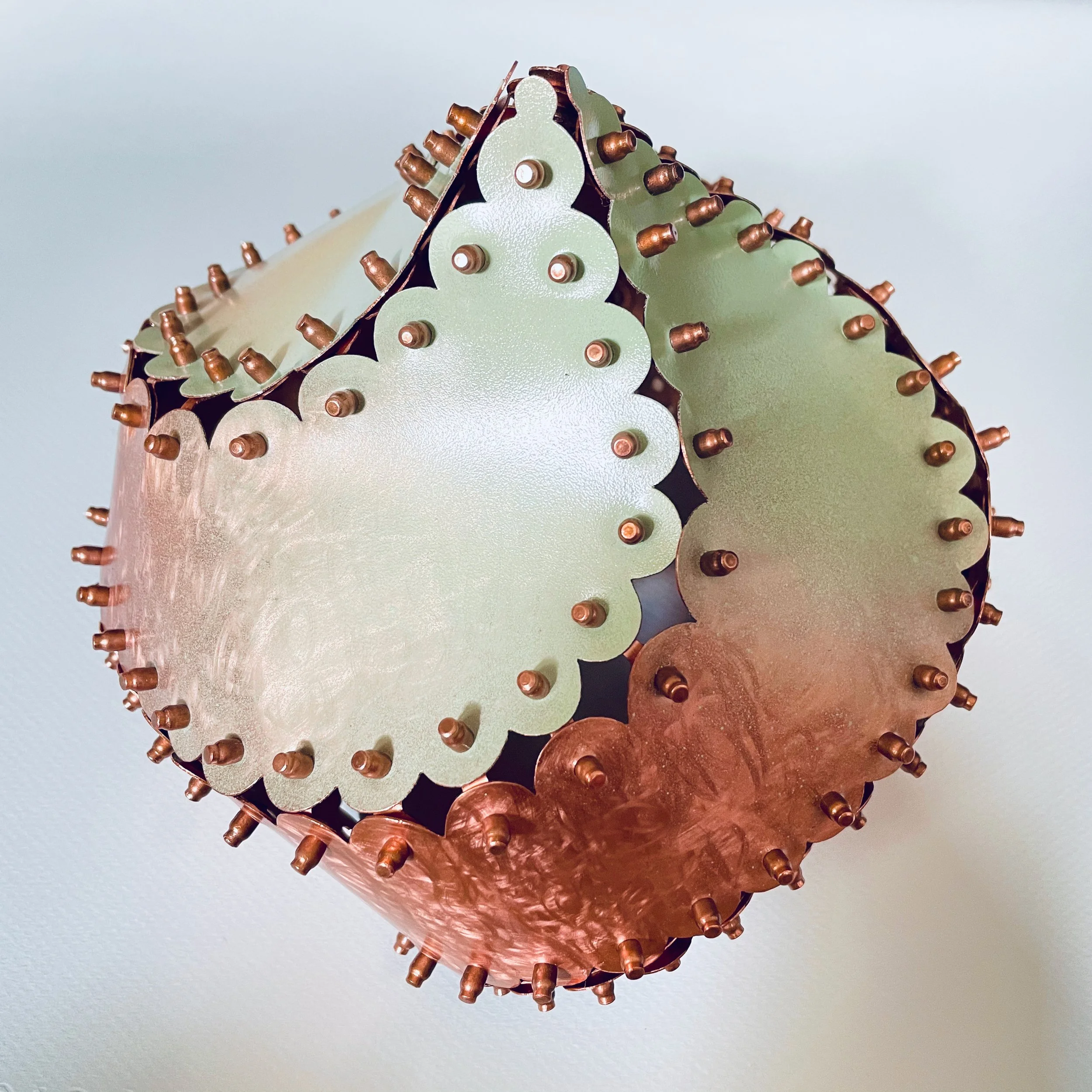 A bubblegum pink polyhedron, handmade from Plexiglass and brass.